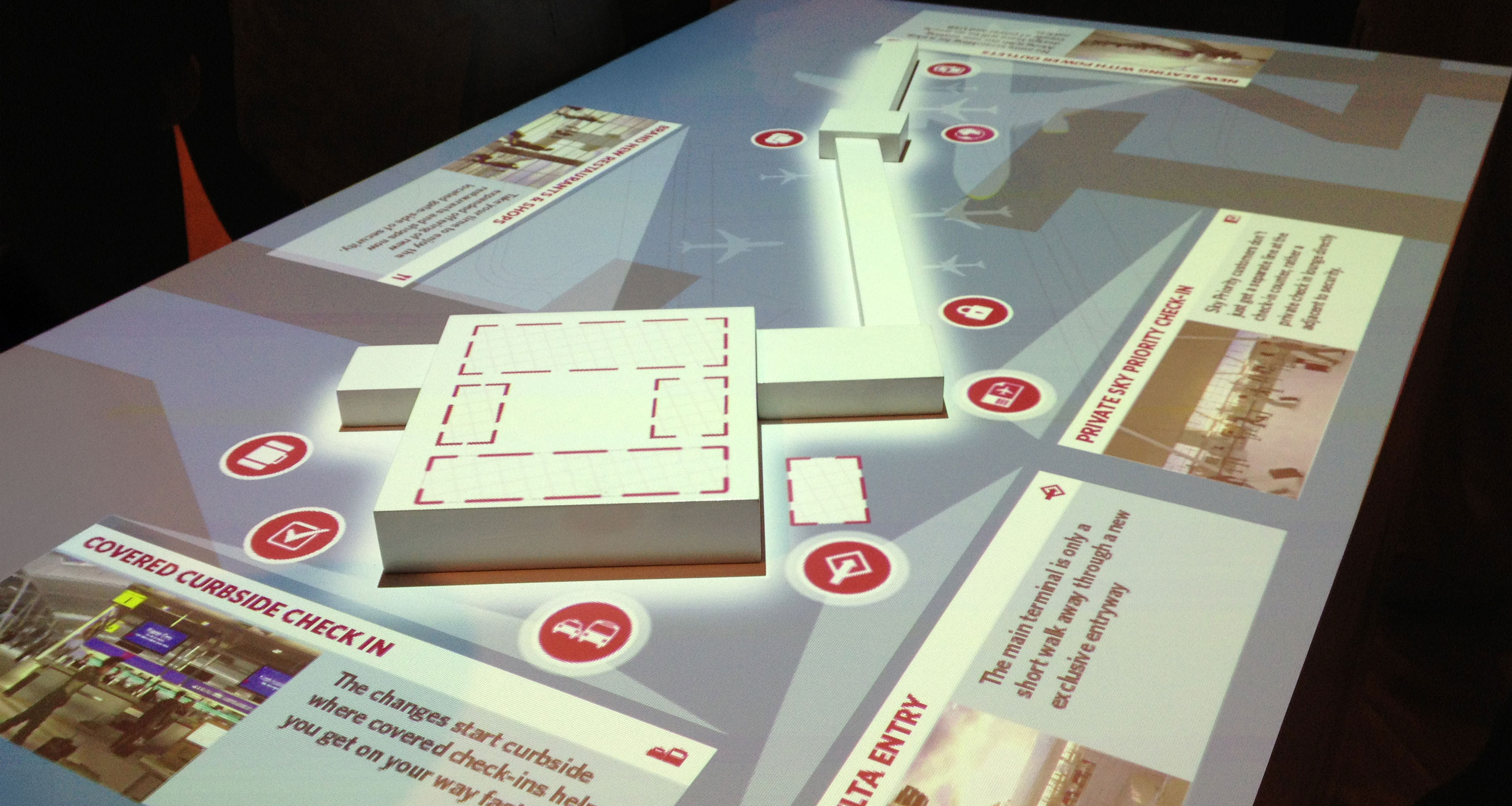 Touch TableDesigned in collaboration with Perch Interactive, the touch table at Delta’s T4 terminal merged physical modeling with projection-based interaction. Users could navigate the new terminal’s features through interactive hotspots, animations, and media, creating an engaging preview experience that delighted executives and offered customers a unique way to explore the new terminal.